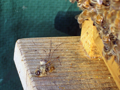 The workers are also kicking out the adult drones. At this point, the unfortunate drones represent nothing more than freeloaders, consumers of nectar and honey so carefully stored in the hive to provide the hope of winter survival. The drones are a liability the colony can no longer afford. Here, a daddy longlegs consumes an evicted drone.