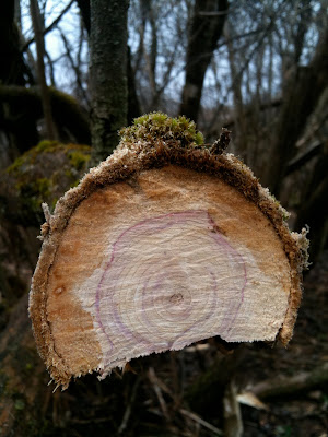 As I began clambering around the tangle of old lilacs and sawing off some of the most accessible of the many dead and damaged branches, I noticed for the first time the burgundy and pinkish coloration swirling in the heartwood—like compacted candy canes or splashes of wine. I guess it should be no surprise that a plant as lovely as the lilac should have a trick or two up its sleeve. Here's what I discovered as I worked.I also enjoyed the diverse textures and coloration of various lichens, mosses, and fungi colonizing the dead branches.